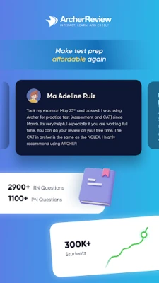 آرچر ریویو، این سی ایل ای ایکس (NCLEX) کی تیاری کے لیے سوالات کے وسیع ذخیرے پیش کرتا ہے۔ اس میں 2950 سے زیادہ NCLEX-RN اور 1100 سے زائد NCLEX-PN سوالات شامل ہیں، جو حقیقی امتحان کے ماحول کی نقل کرتے ہیں۔ نئے NGN-NCLEX پیٹرن کے مطابق جدید ترین سوالات ہر ہفتے شامل کیے جاتے ہیں، جن میں آئندہ نسل کے این سی ایل ای ایکس آئٹمز، واحد انتخاب، SATA (select all that apply)، خالی جگہیں پُر کریں، ترتیب وار سوالات، آڈیوز/تصاویر اور کیس اسٹڈیز بھی شامل ہیں۔ متعدد تیاری کے جائزے آپ کو اپنی پیشرفت جاننے میں مدد دیتے ہیں، جبکہ کمپیوٹر اڈاپٹو ٹیسٹنگ (CAT) موڈ بالکل این سی ایل ای ایکس کی طرح آپ کی کارکردگی کے مطابق سوالات پیش کرتا ہے۔ "پیئر اسٹیٹس" کی خصوصیت آپ کو ہم جماعتوں سے موازنہ کرنے اور اپنی تیاری کا صحیح اندازہ لگانے کا موقع فراہم کرتی ہے۔